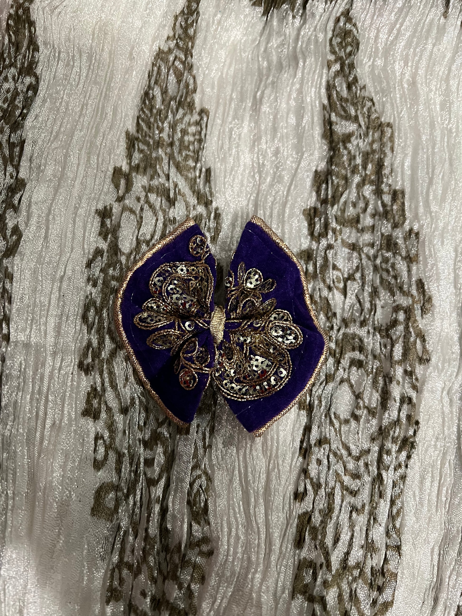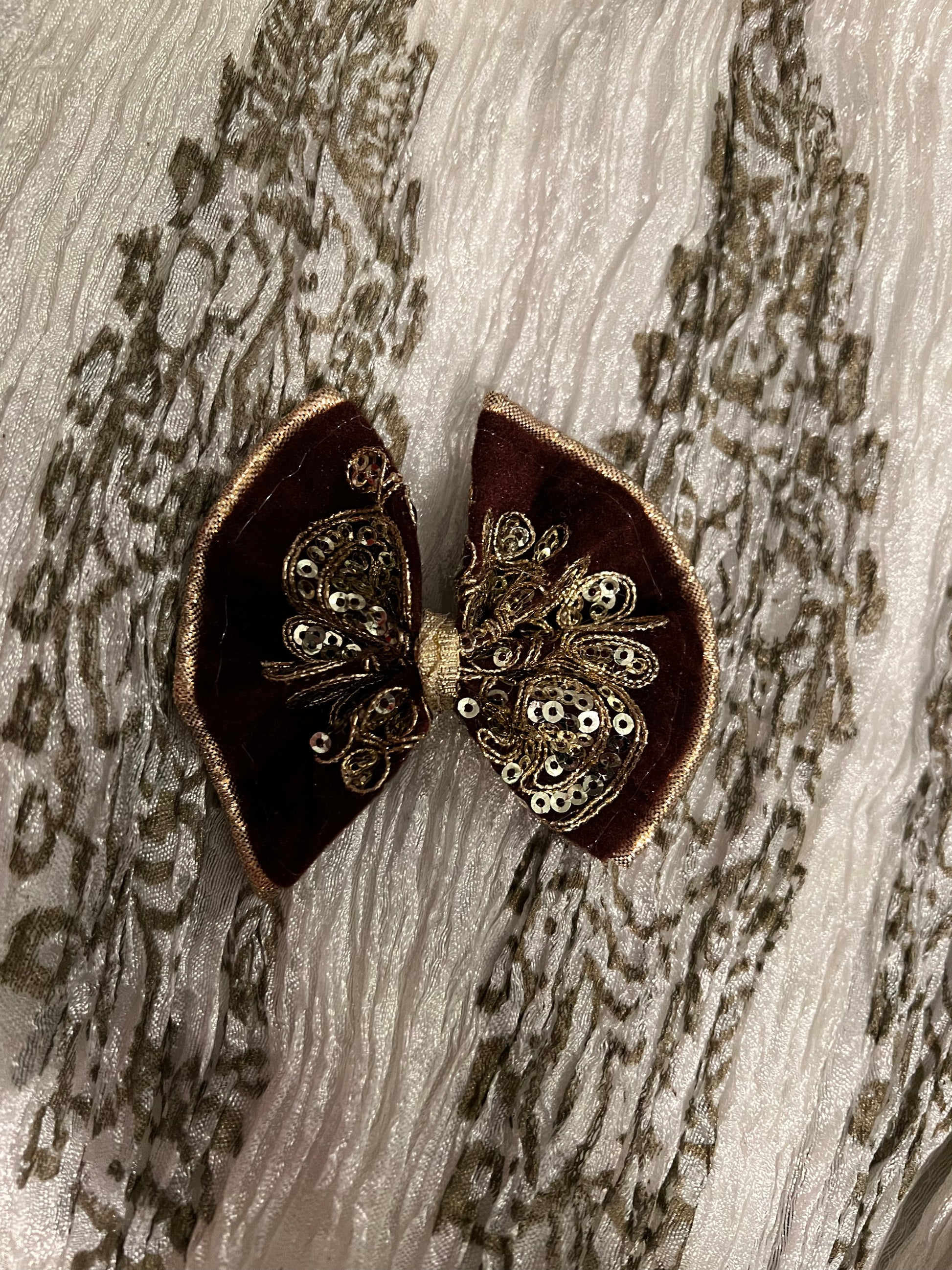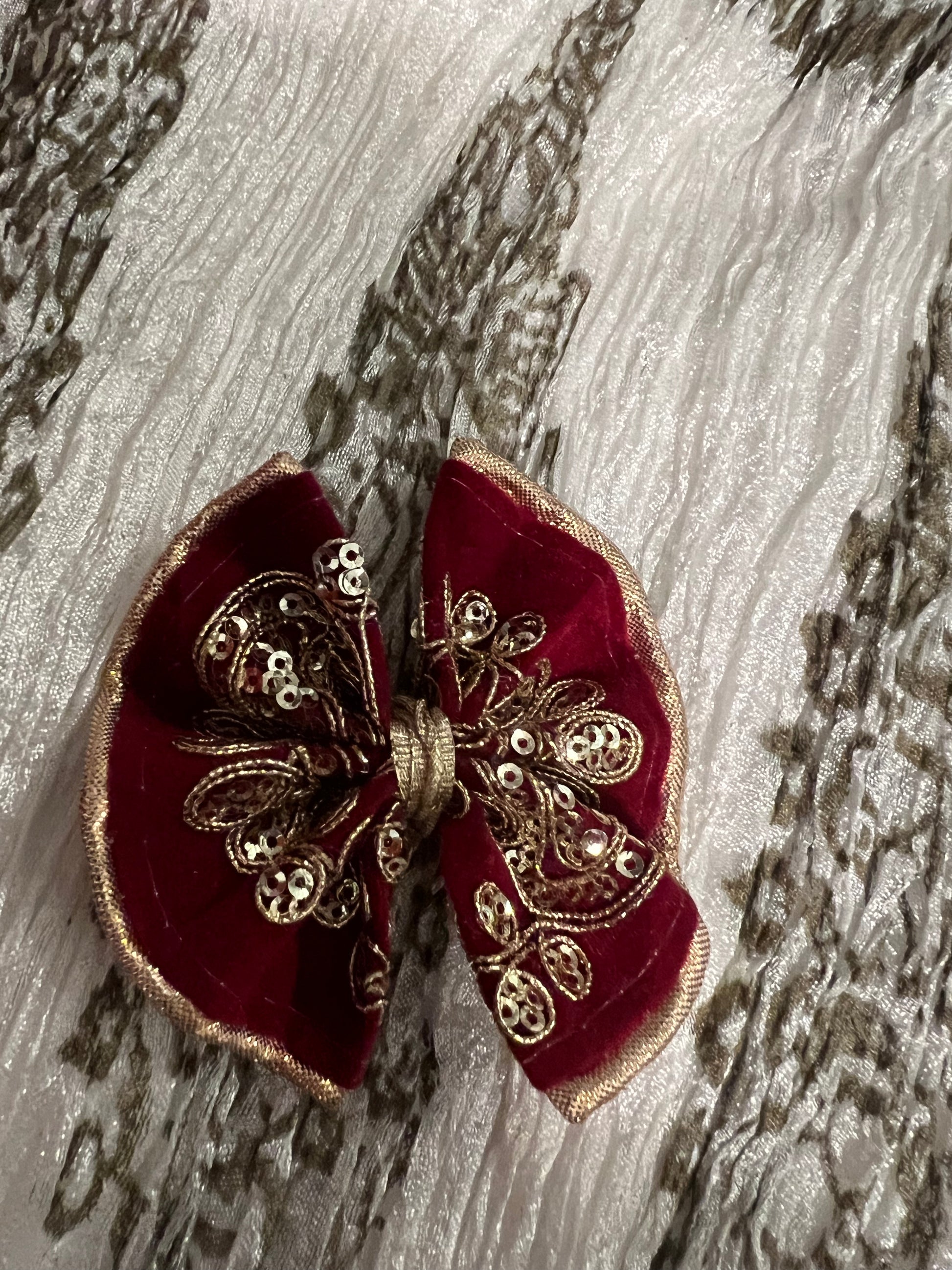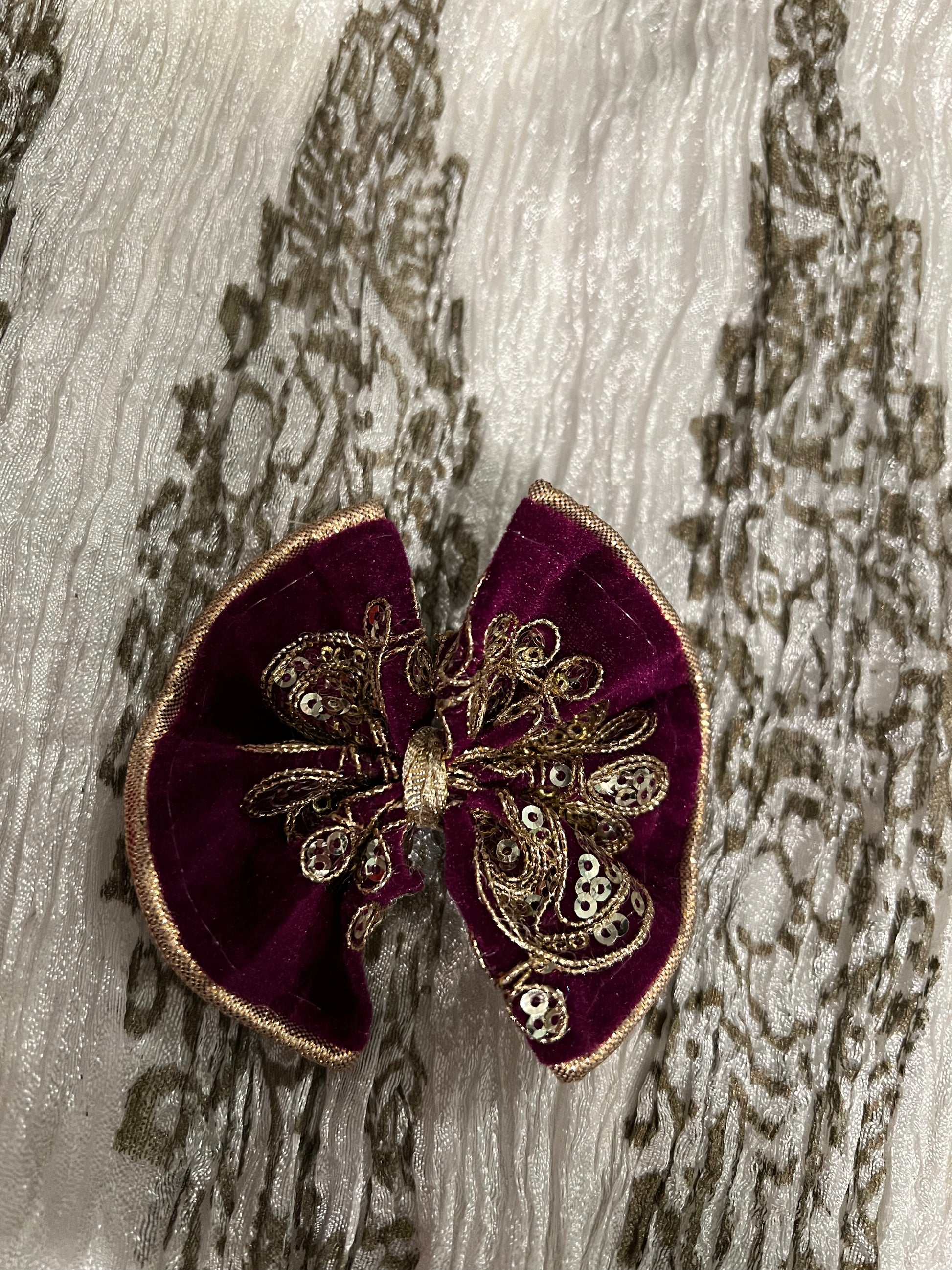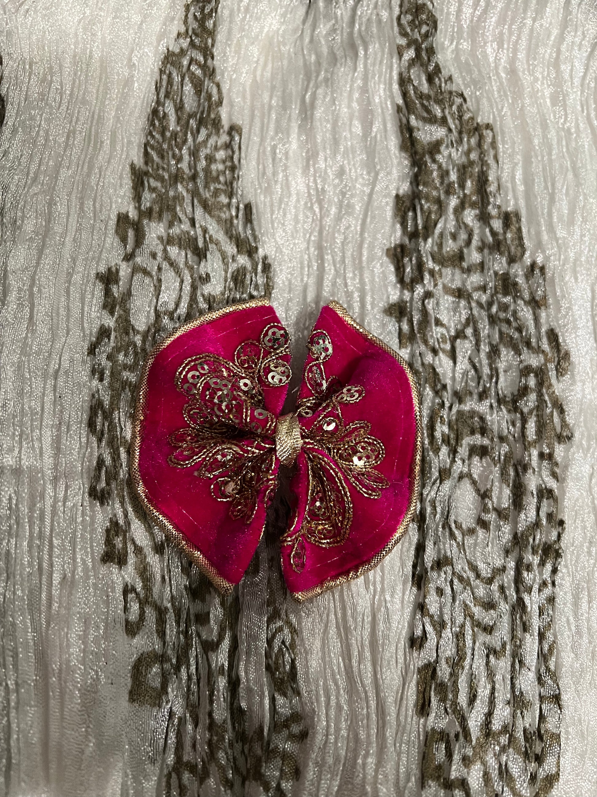 Hot pink velvet bow with gold embroidery and sequins