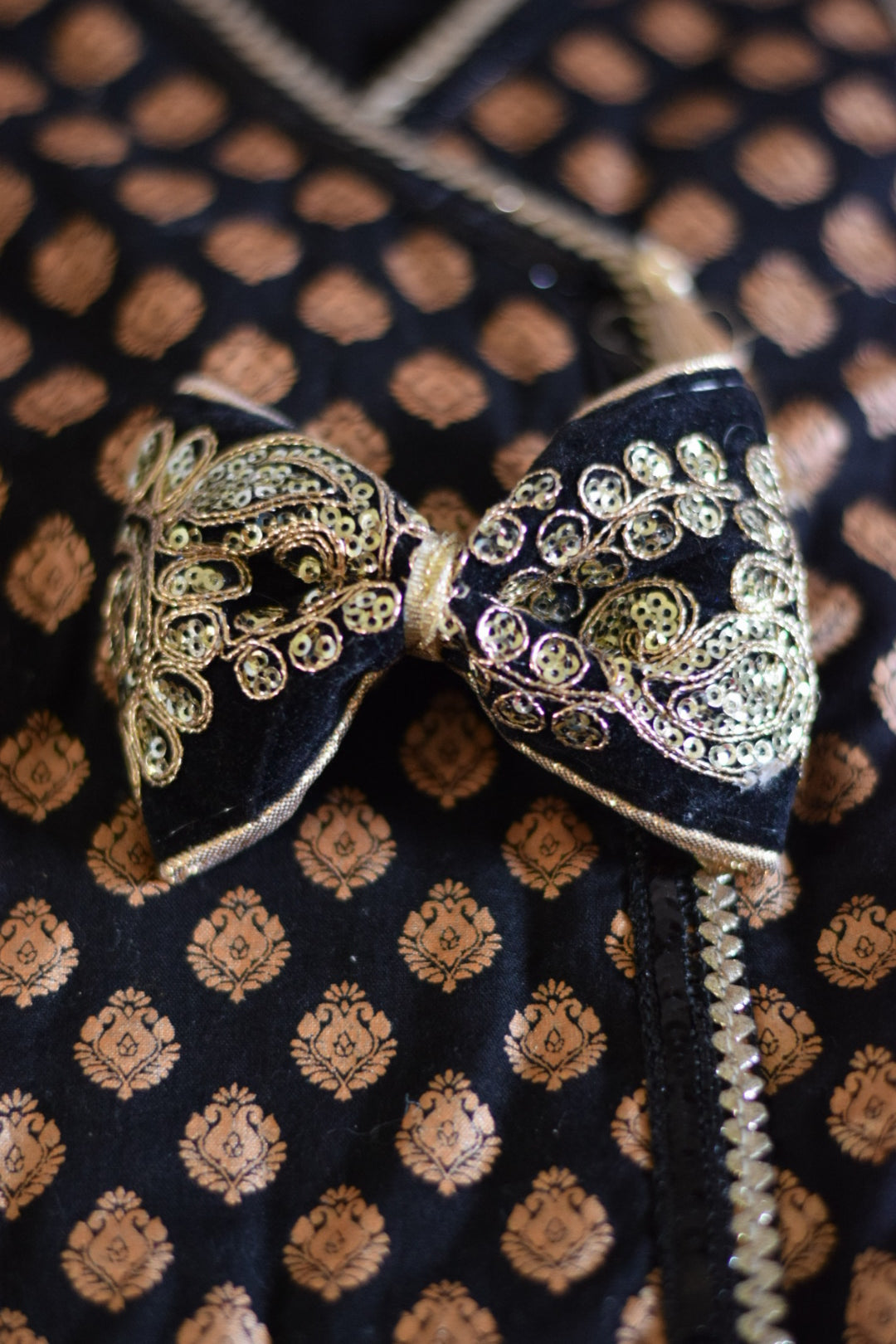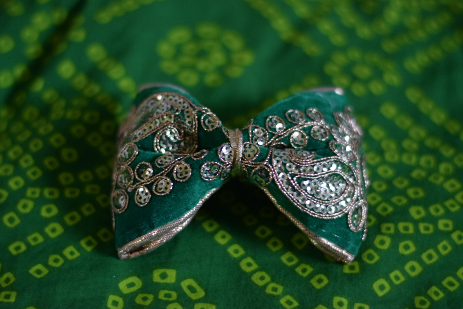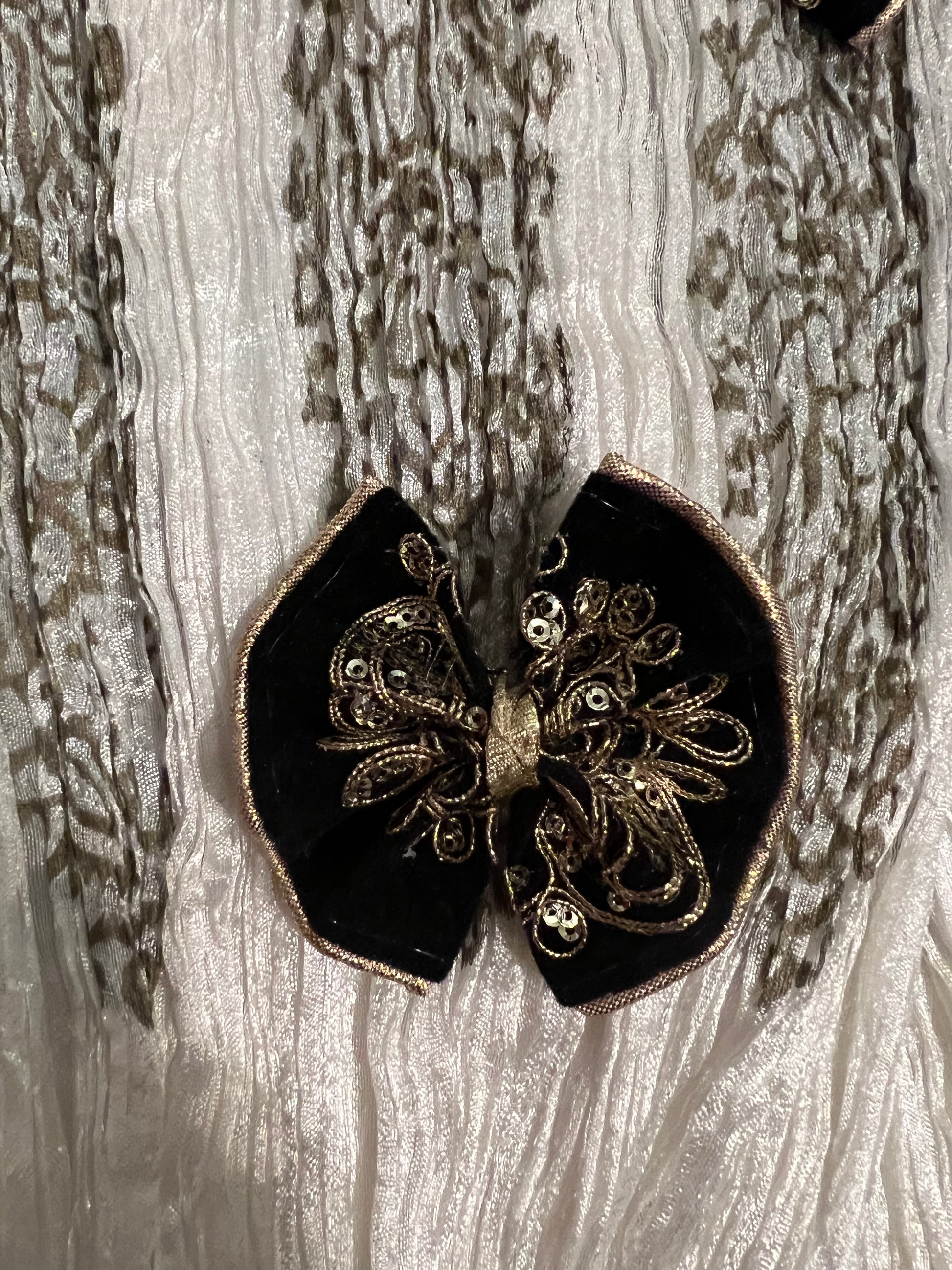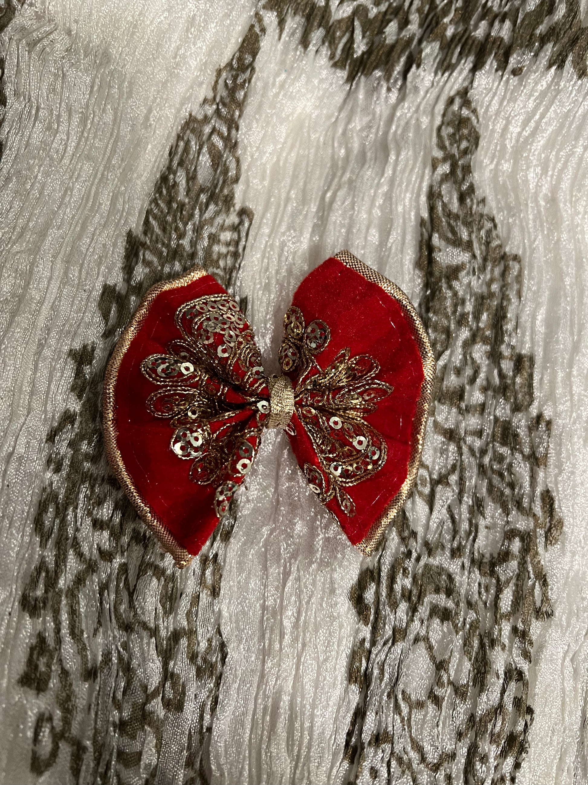Hot pink velvet bow with gold embroidery and sequins
